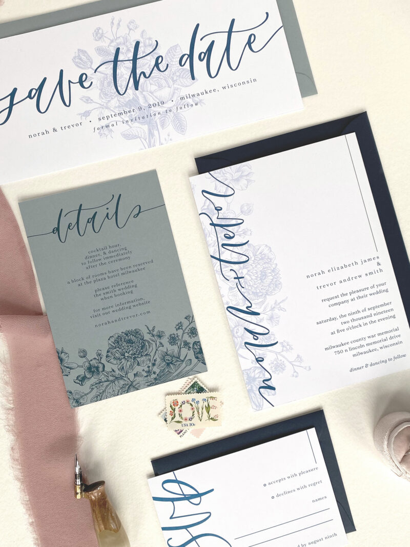 The Romantic is perfect for the couple who likes things a little on the softer side and wants the romance to be front and center. This suite combines a beautiful vintage floral drawing, a softer calligraphy style, and modern text design. With a unique colored details card included in this suite, it is sure to be a show stopper for the loved ones who receive it.