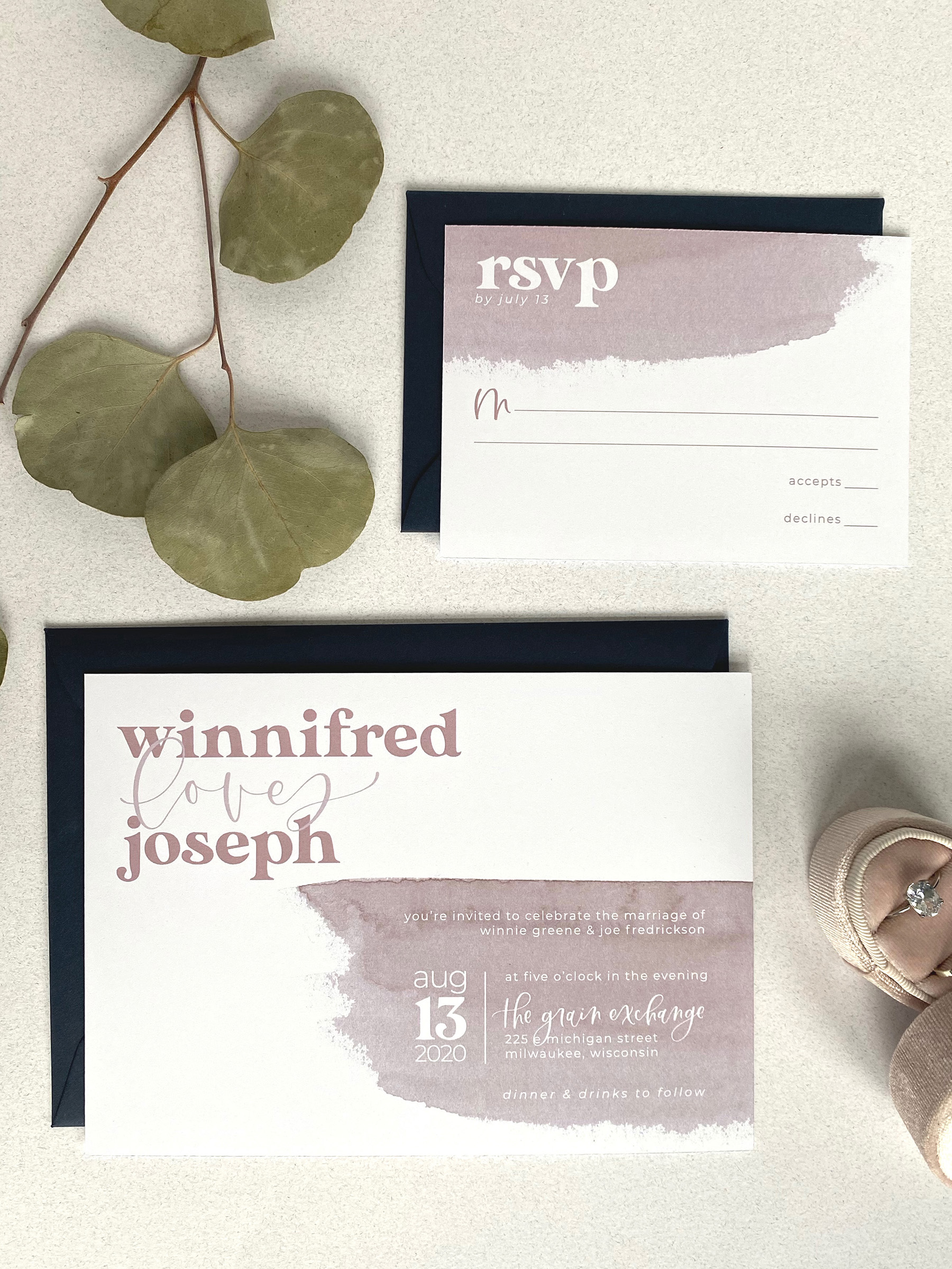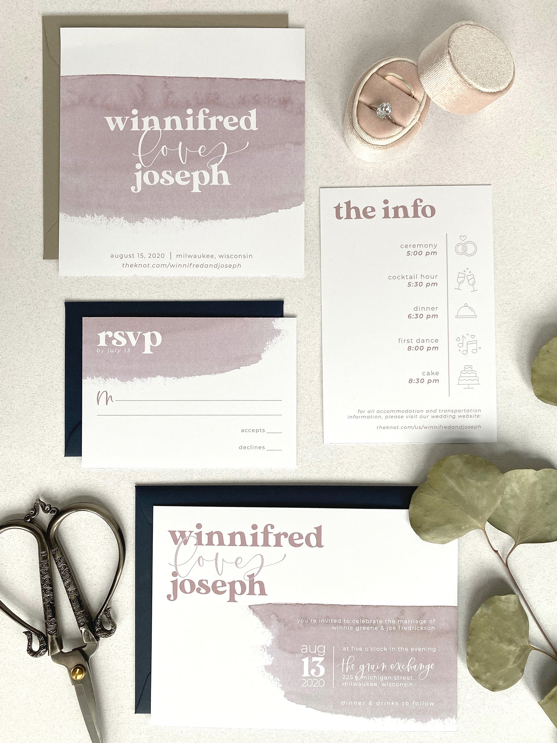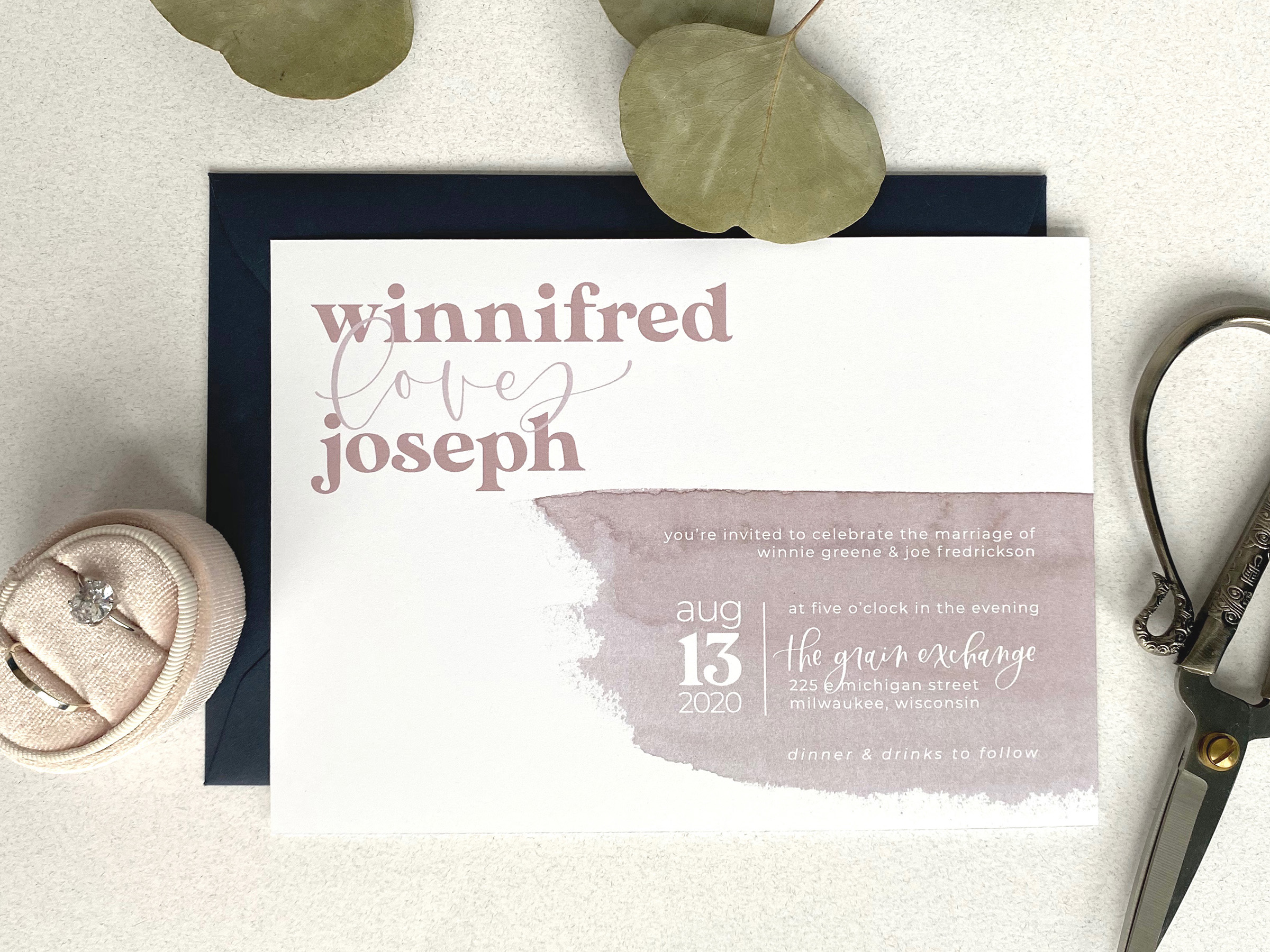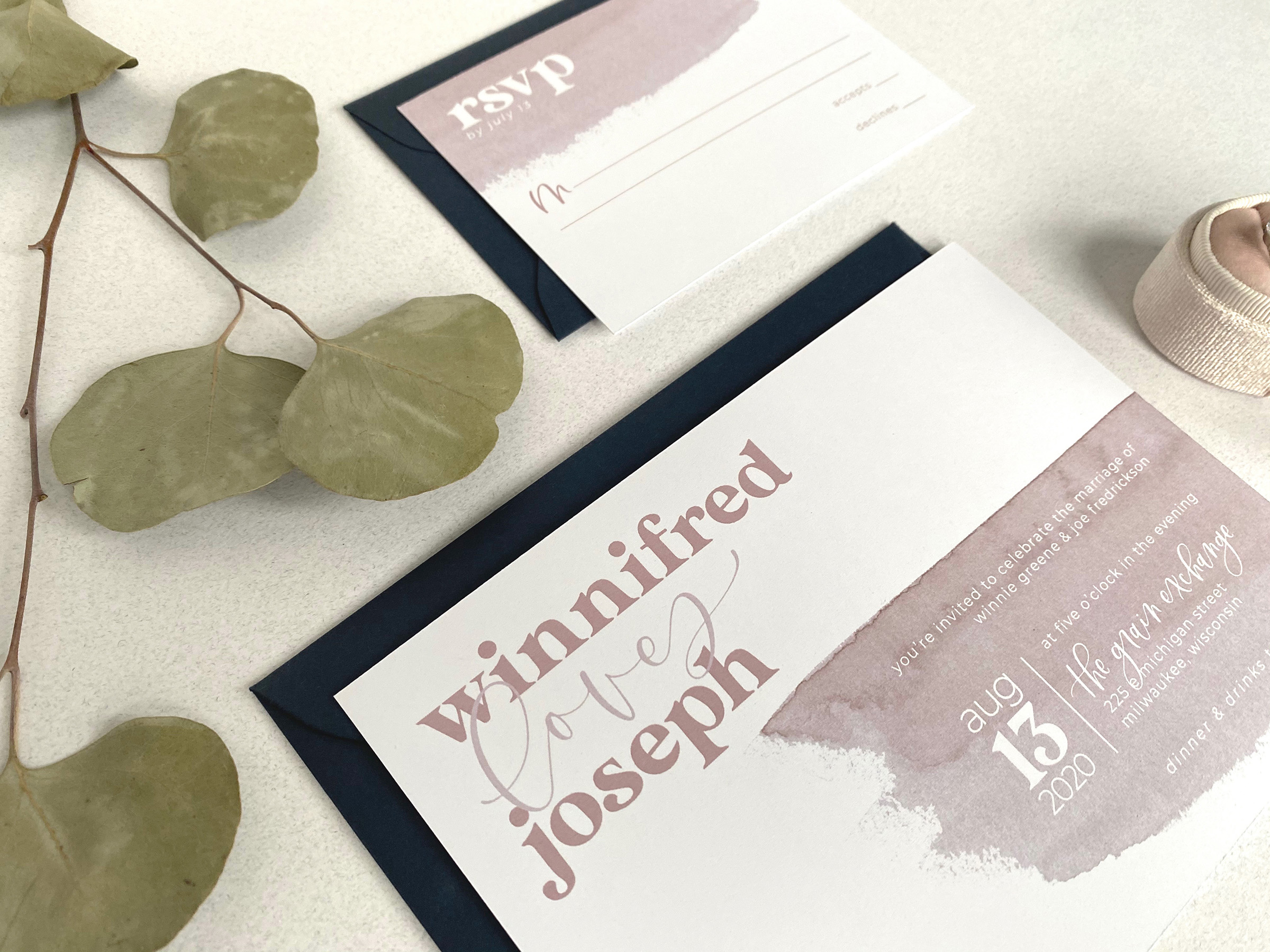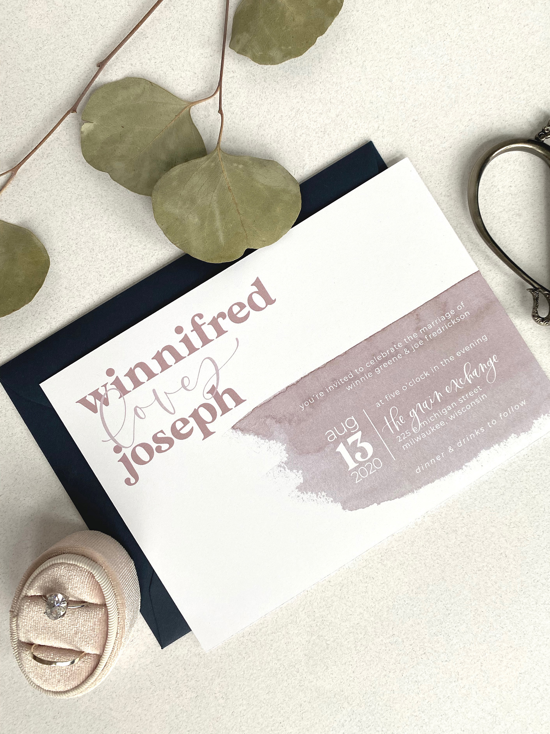 The Quirky is perfect for the couple who is looking for their wedding to be a little more whimsical and out of the box. With a printed watercolor detail, a vintage font, and modern calligraphy, The Quirky is the perfect first impression to get your guests excited for a wedding that is as unique as your love.