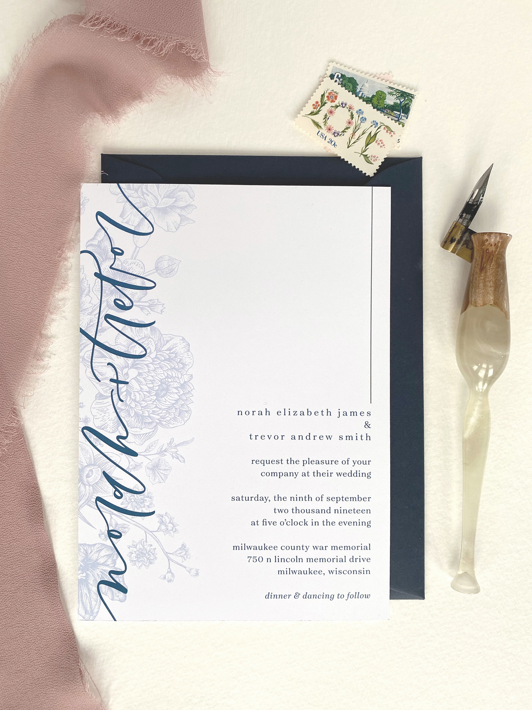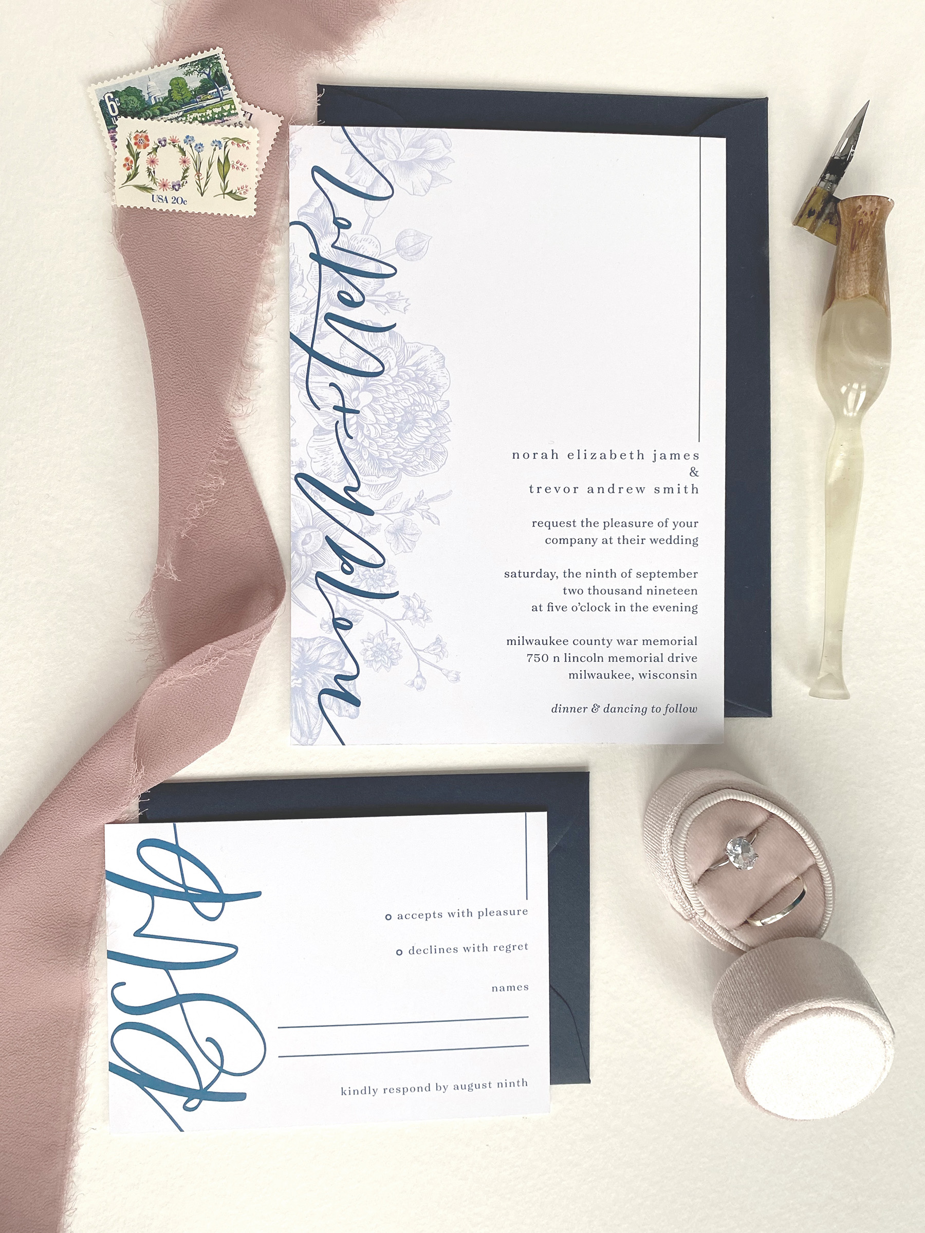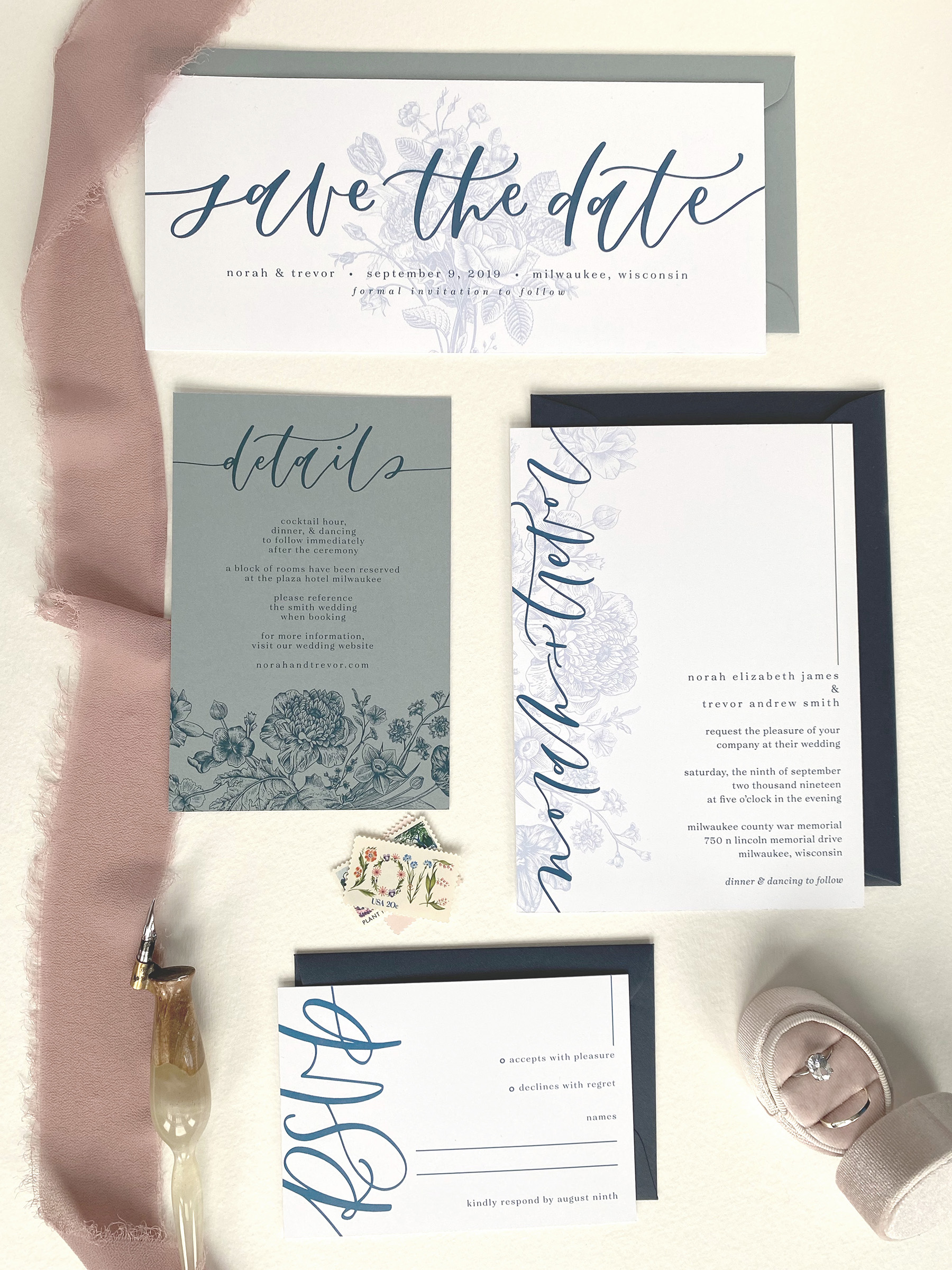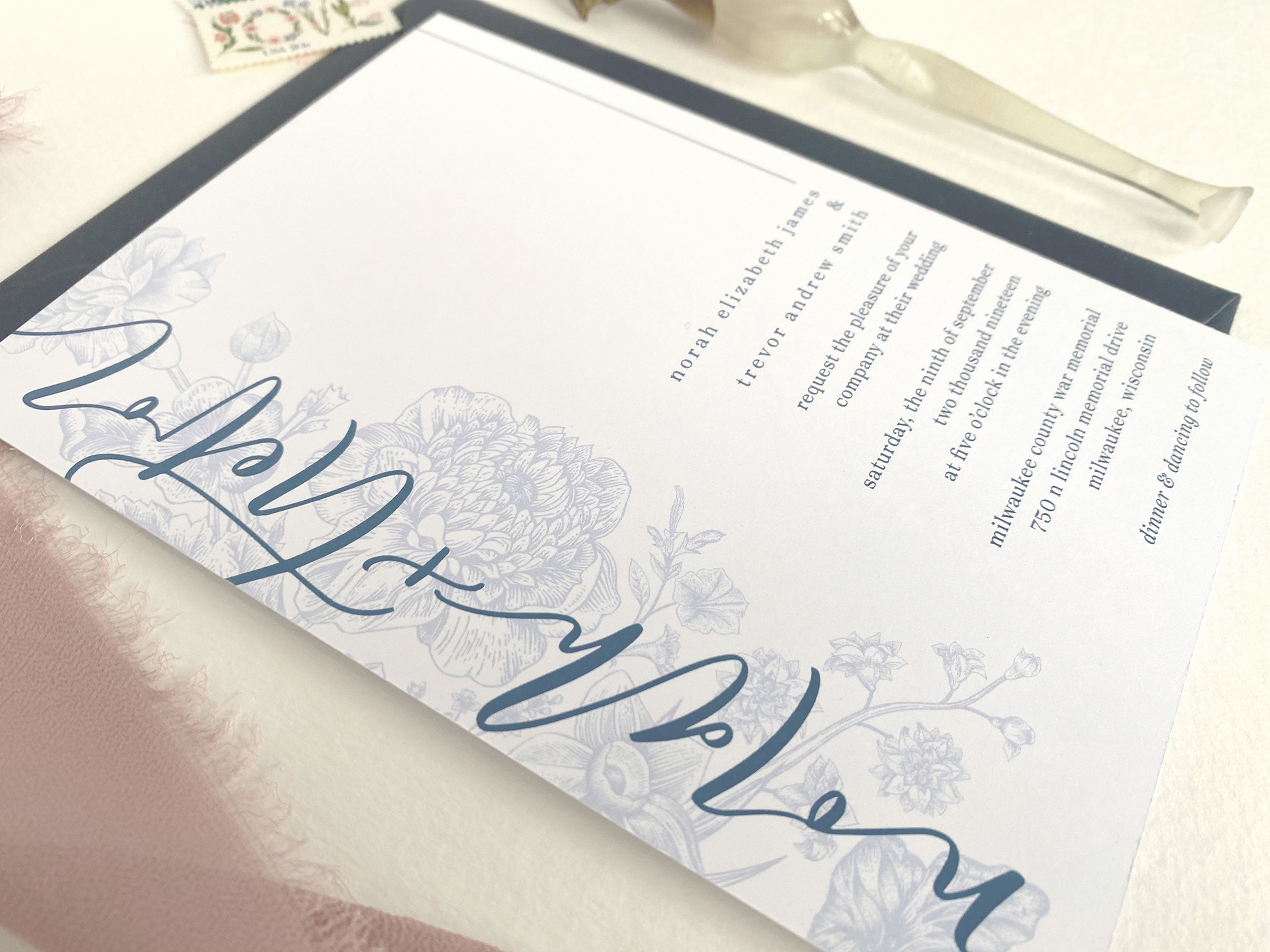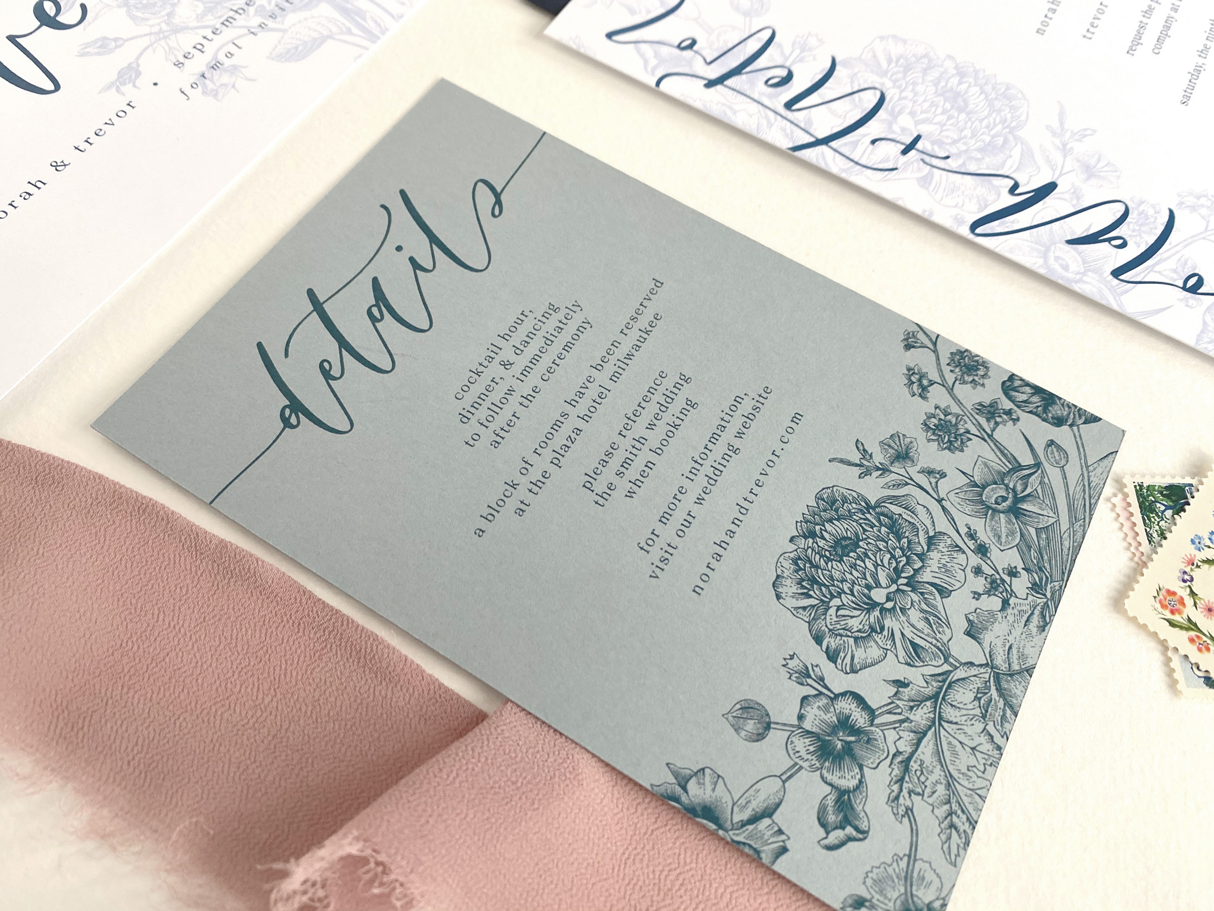 The Romantic is perfect for the couple who likes things a little on the softer side and wants the romance to be front and center. This suite combines a beautiful vintage floral drawing, a softer calligraphy style, and modern text design. With a unique colored details card included in this suite, it is sure to be a show stopper for the loved ones who receive it.